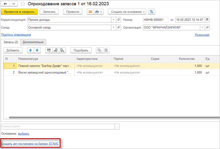 При проведении прикладных документов, предполагающих ввод на их основании документов ЕГАИС, автоматически формируются гиперссылки для создания соответствующих документов ЕГАИС. Также автоматически заполняется раздел «К оформлению» в панели обмена с ЕГАИС. При этом учитываются: тип документа, вид операции, наличие маркируемой или немаркируемой алкогольной продукции и др. Добавили возможность формирования документа «ТТН Исходящая ЕГАИС» на основании расходной накладной.