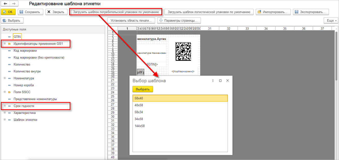 Теперь при нажатии кнопки загрузки шаблона упаковки в форме редактирования макета открывается список новых шаблонов. Здесь же можно настроить вывод дополнительных полей.