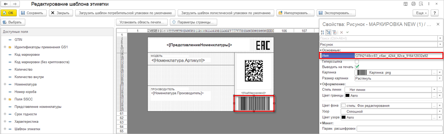 В качестве примера данная возможность реализована в шаблоне потребительской этикетки размером «144х58». На рисунке ниже имя рисунка соответствует шаблону [GTIN*].