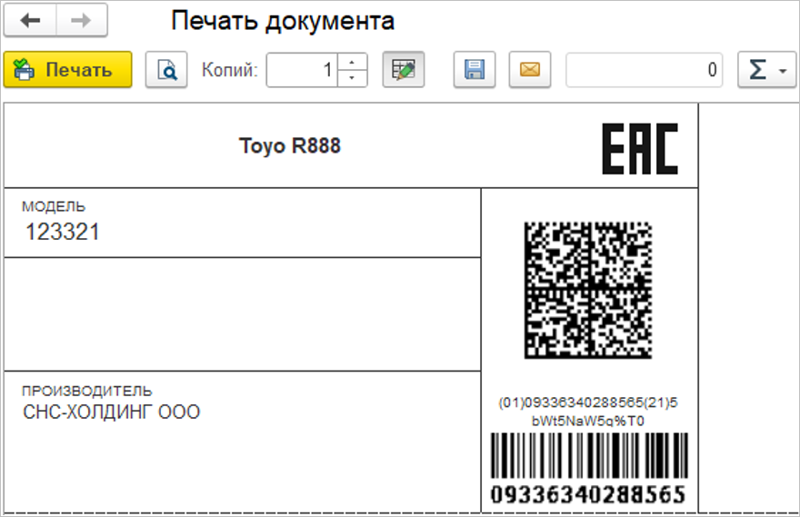 При выводе на печать такая этикетка будет выглядеть следующим образом: