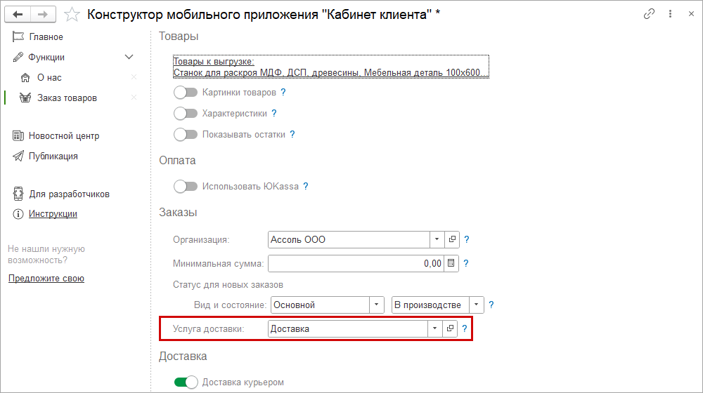 Услуга доставки. Оформлять доставку товаров, заказанных через мобильное приложение, стало удобнее. Появилась возможность указать, какую услугу добавлять в заказ покупателя для доставки с помощью настройки "Услуга доставки" в конструкторе мобильного приложения.