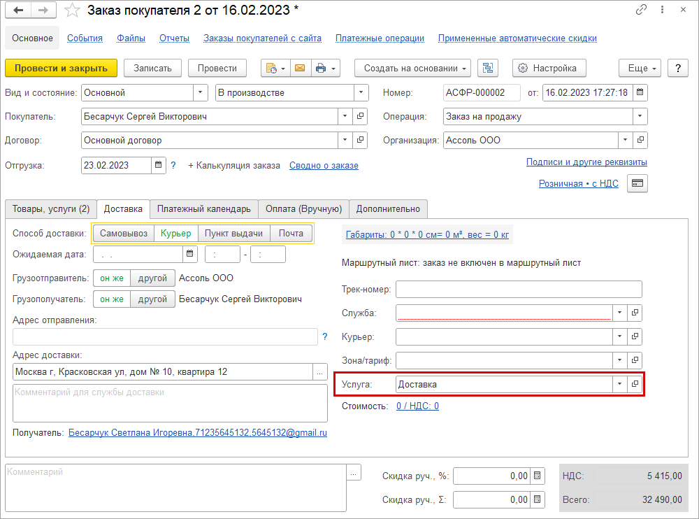 Значение, указанное в поле "Услуга доставки" конструктора, будет использоваться для автозаполнения поля "Услуга доставки" во всех документах "Заказ покупателя", загруженных из "Кабинета клиента".