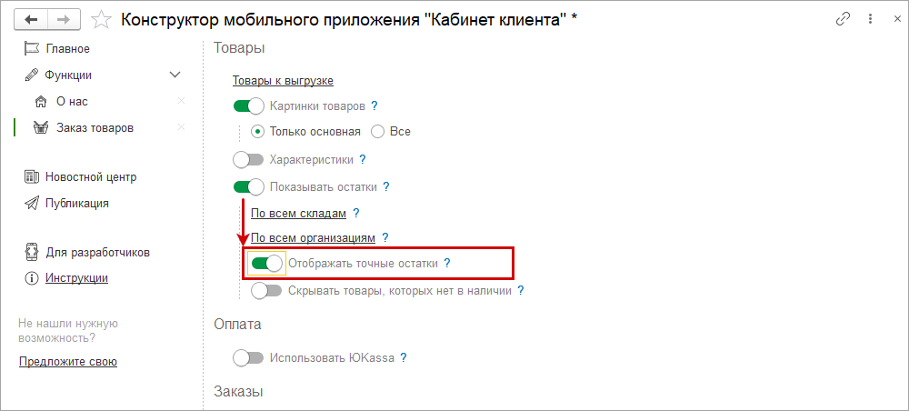 Для отображения у клиента количества товаров в наличии при конструировании приложения включаем настройку "Показывать остатки" и "Отображать точные остатки".