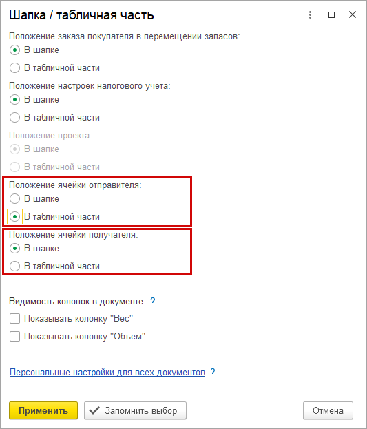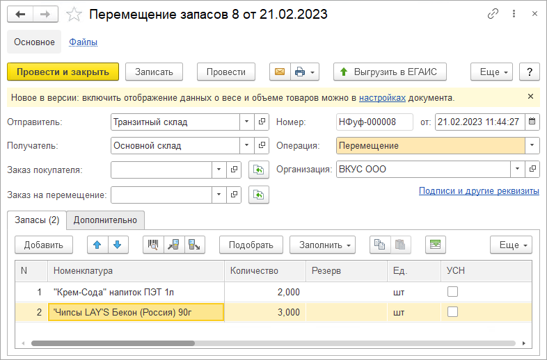 Теперь при оформлении документов можно следить за весом и объемом товаров. Непосредственно в документе можно настроить показ колонок с весом и объемом, добавлена подсказка о наличии такой возможности, выводятся итоговые суммы. Новая возможность доступна для документов: "Заказ на перемещение" и "Перемещение запасов". Возможность настройки в самом документе сохранилась и для документов "Счет на оплату", "Заказ покупателя" и "Расходная накладная".