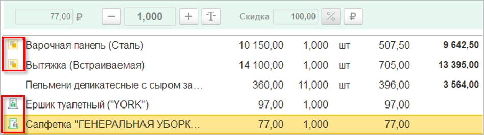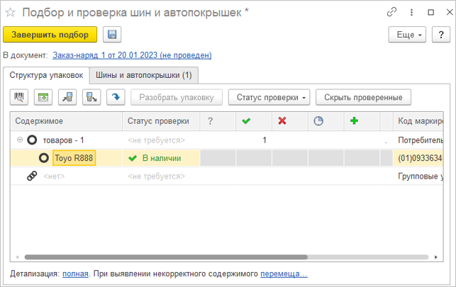 Как и в других документах, поддерживающих работу с маркируемой продукцией, на закладке «Товары» документа «Заказ-наряд» теперь отображаются: