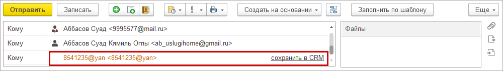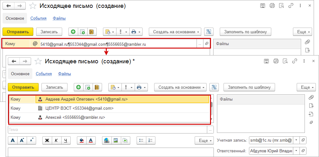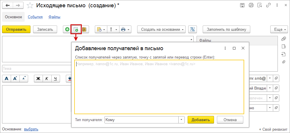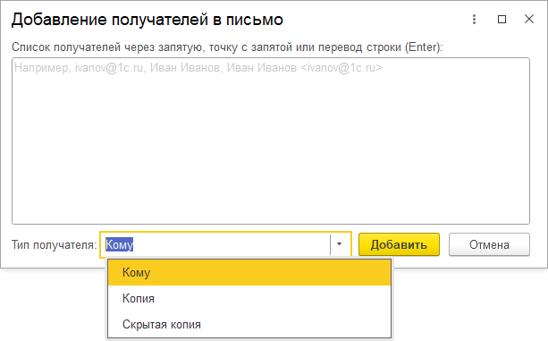 Для всего списка получателей, добавленного через данную форму, задается единый тип: "Кому", "Копия" или "Скрытая копия".