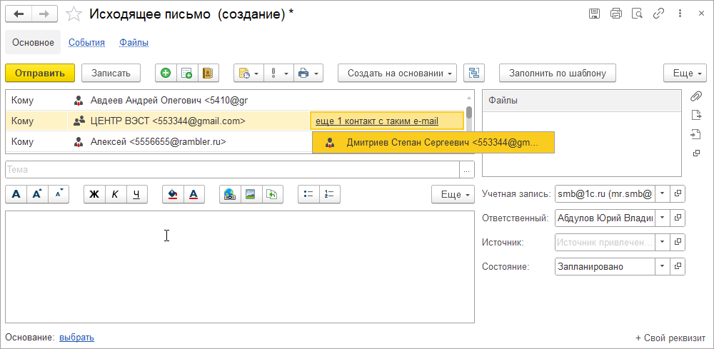 Если в базе записано несколько контактов с одинаковыми адресами электронной почты, можно выбрать, какой из контактов записать как адресата письма.