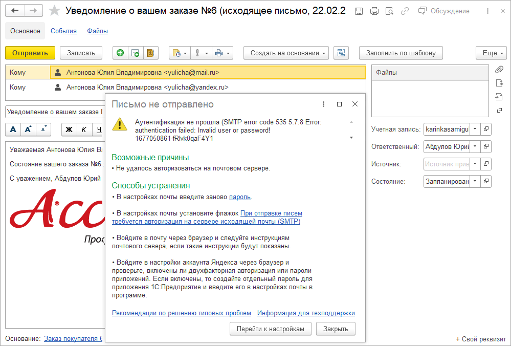 Например, если изменились данные для авторизации учетной записи почты, будет доступно сообщение об ошибке. Также в окне будут предложены рекомендации по устранению типовых проблем возникающих при подключении к почтовому клиенту.
