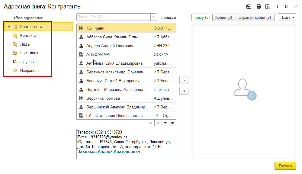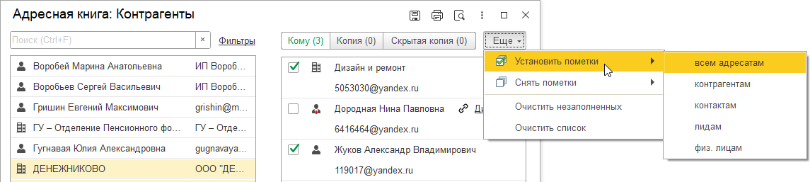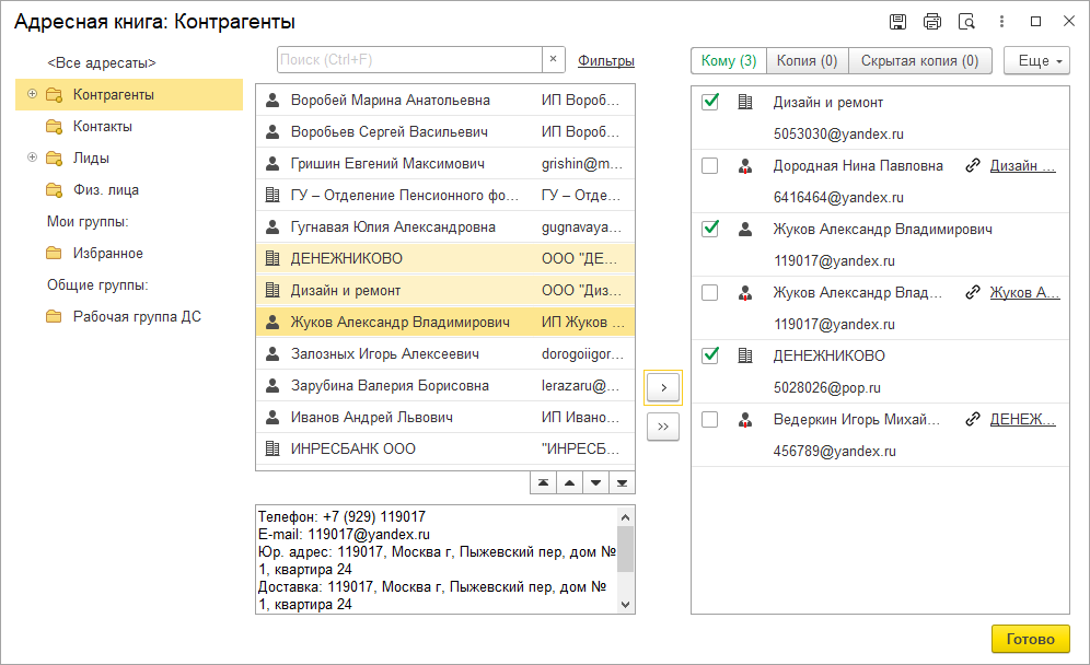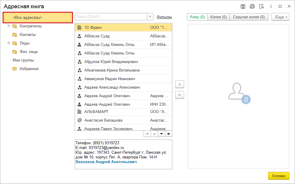 При переносе в правый список выбирается не только сам адресат из списка, но и связанные с ним контакты и контрагенты.