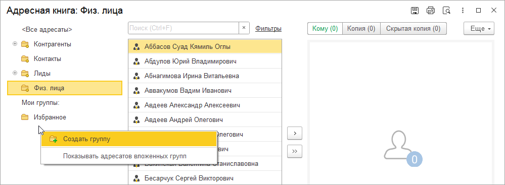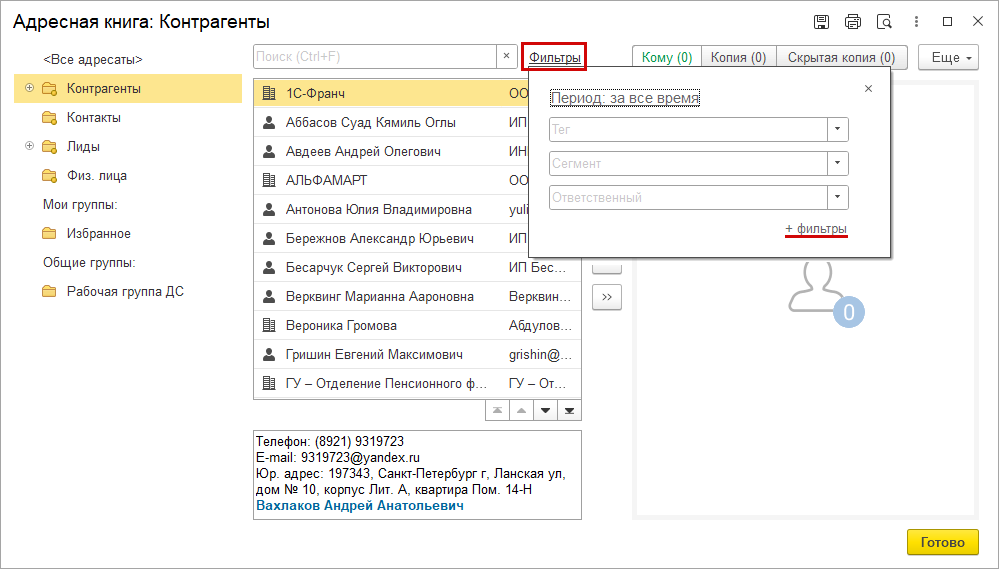 Значение отбора в левой панели сохраняется. При следующем открытии в адресной книге сразу будет установлен отбор по типу контакта или группе адресата.
