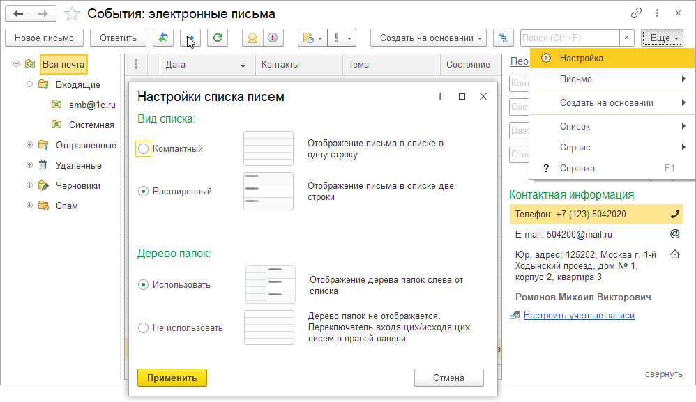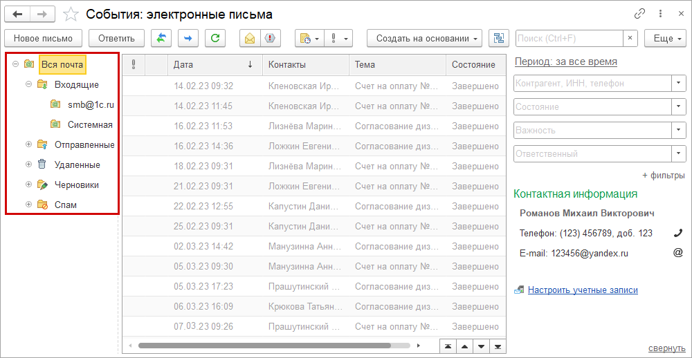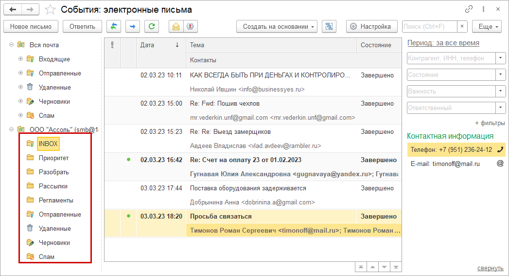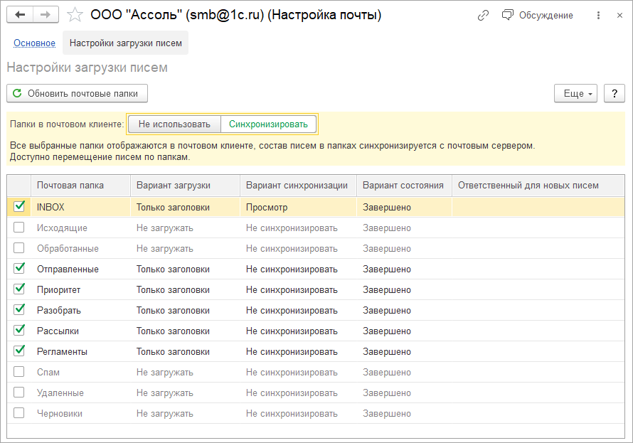 Появилась возможность настроить структуру папок для задач менеджеров на стороне почтового сервера. Благодаря двусторонней синхронизации почтовые папки появятся в почтовом клиенте 1С.