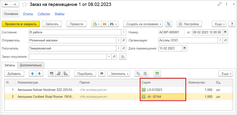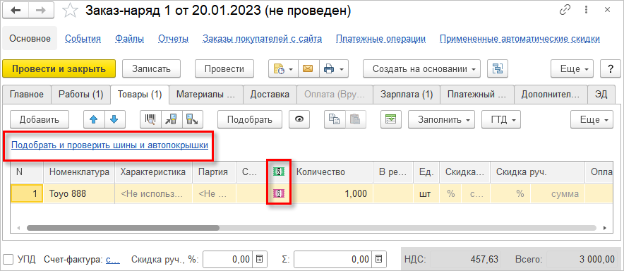 Поддержана работа с маркируемой продукцией в документе "Заказ-наряд".Такая возможность будет полезна, например для автомастерской, выполняющей шиномонтажные работы по снятию старых шин и монтажу новых, которые клиент приобретает в этой же компании.