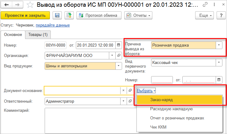 Не смотря на то, что основным сценарием выбытия марки является пробитие чека, дополнительно в программе был реализован механизм заполнения документа «Вывод из оборота ИС МП». Создать документ можно из рабочего места "Обмен с ИС МП (обувь, одежда, табак…)". В качестве документа-основания в данном случае используется документ «Заказ-наряд», выбранный вручную. Выбор основания доступен для вывода из оборота при розничной продаже.
