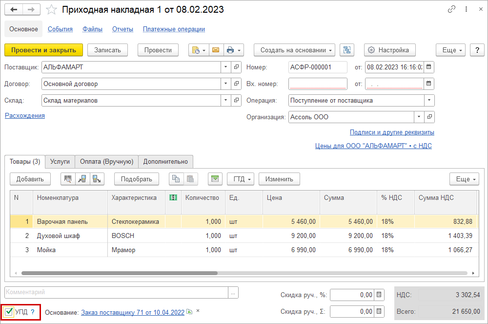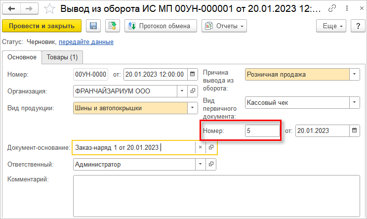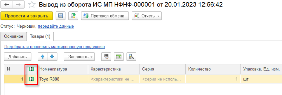 При этом сведения о товарах и кодах маркировки будут заполнены автоматически из документа-основания.