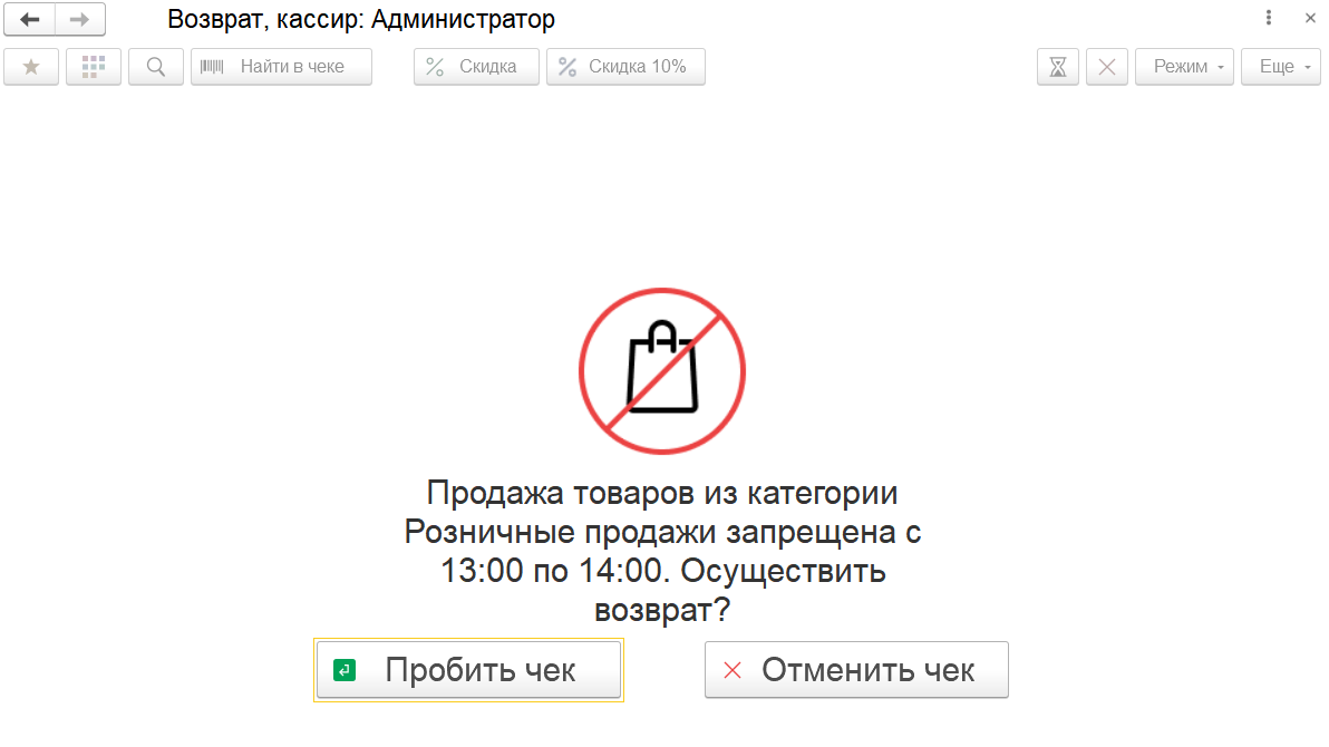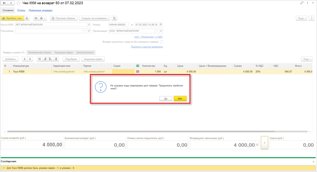 Если при оформлении возврата код маркировки не был указан, то программа выведет диалоговое окно, в котором можно выбрать продолжать ли пробитие такого чека или нет.