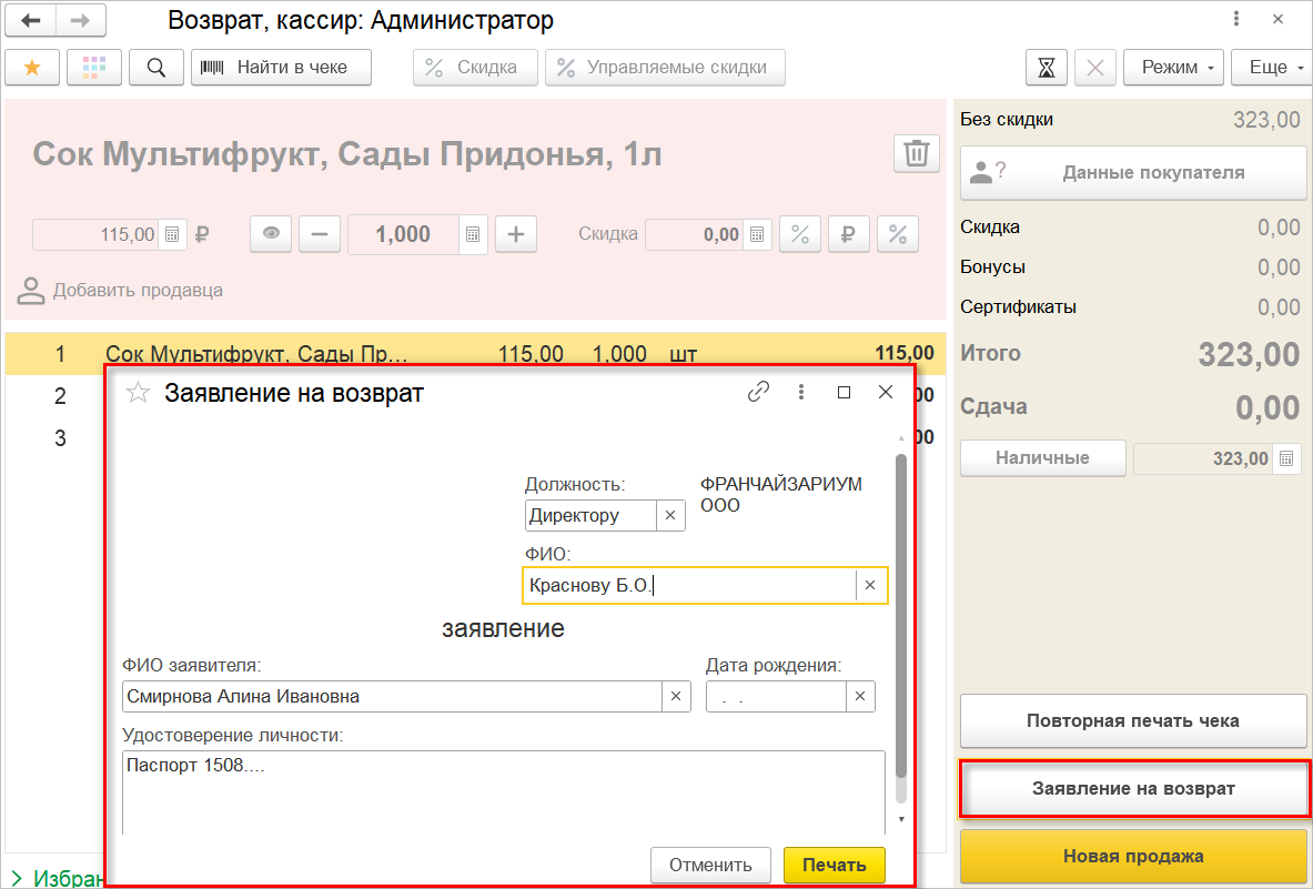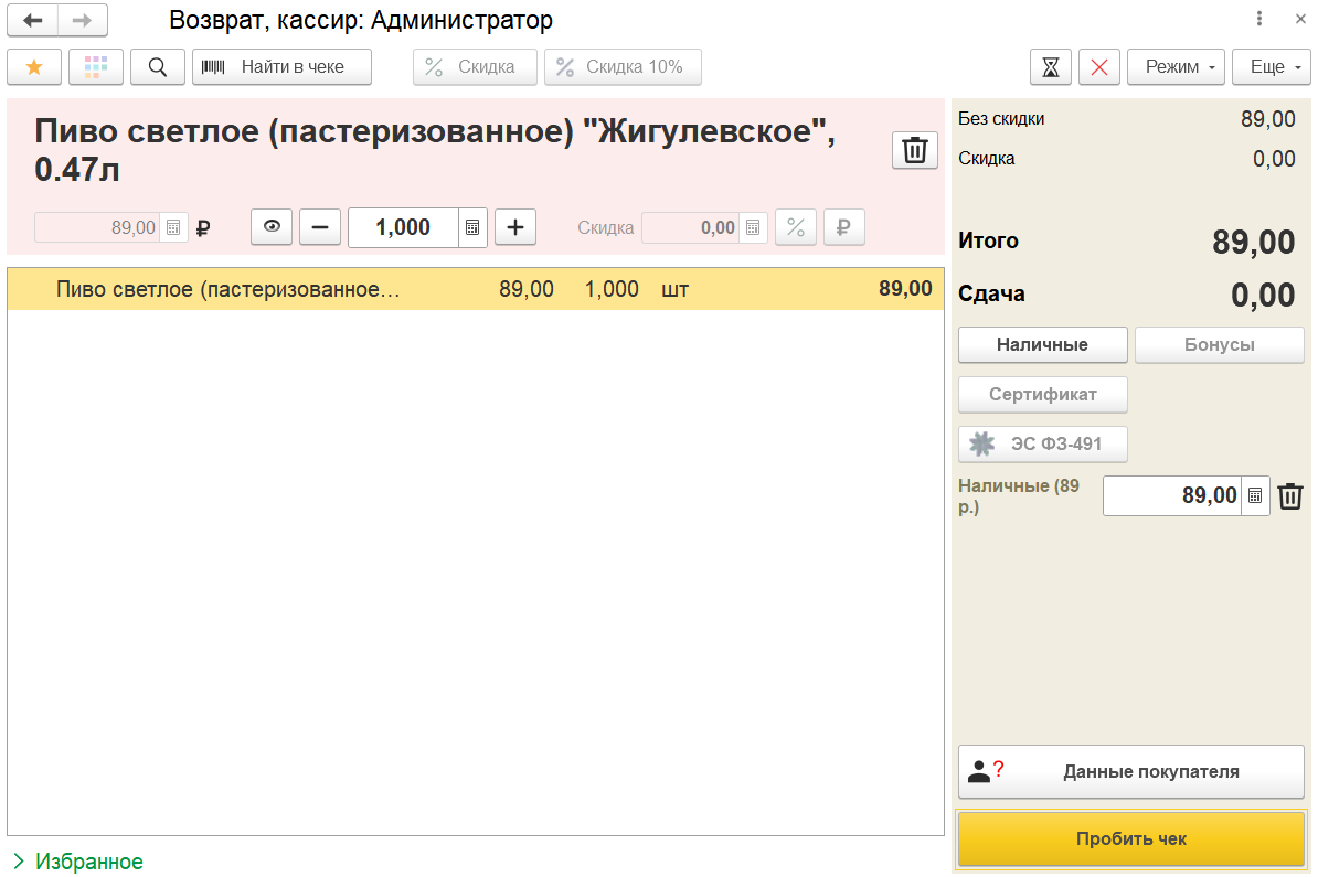 Указание кодов маркировки при оформлении чека на возврат носит рекомендательный характер, так как бывают ситуации, когда марка повреждена или вовсе отсутствует. В связи с этим в новой версии программы была поддержана возможность пробития чека на возврат маркируемой продукции без указания кода маркировки.