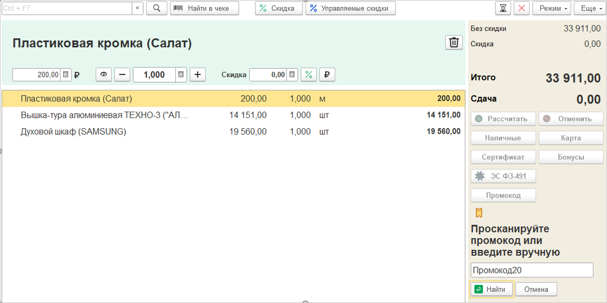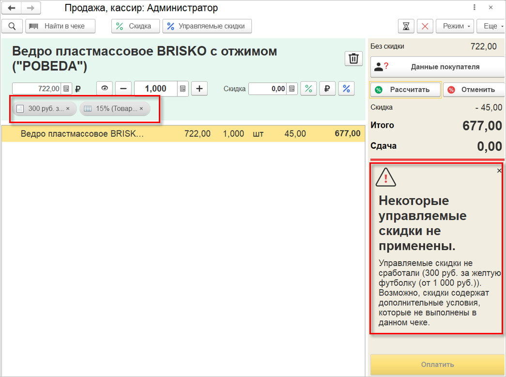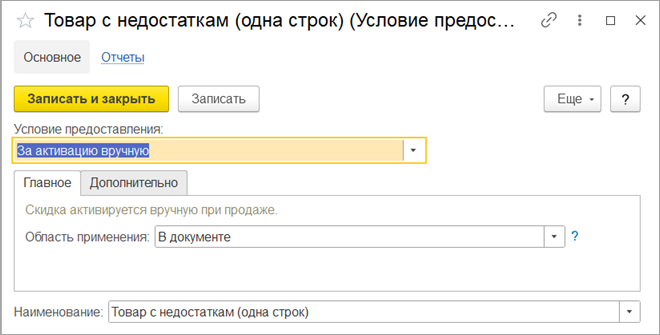 Настраиваем применение скидки с помощью нового типа условий «Активация вручную». Активировать можно в целом для документа, либо для отдельной строки. Можно использовать несколько условий скидки, из которых одно – условие на ручную активацию. Такая скидка считается управляемой. Скидка сработает, если все прочие условия будут выполнены, и кассир вручную активирует ее при продаже.