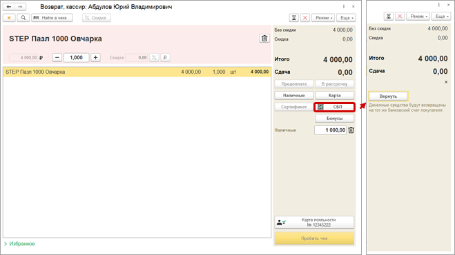 Добавили возможность передать вместе с Чеком ККМ на возврат и его основание, по которому определяется себестоимость в 1С:БП.