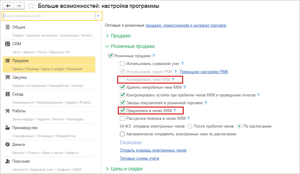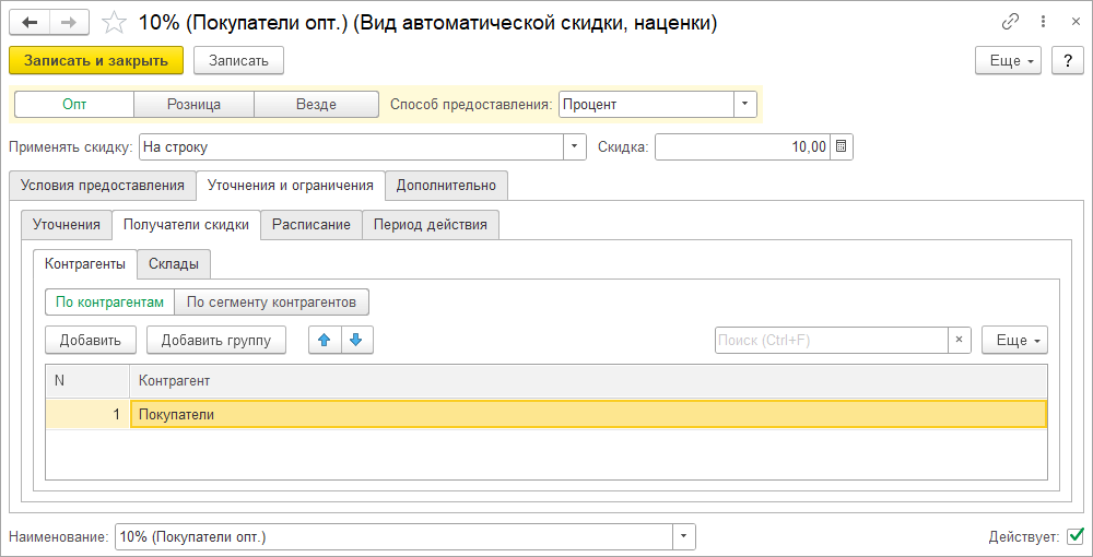 Теперь фильтры по получателю автоматических скидок работают одинаково в опте и в рознице: можно ограничить скидки по контрагенту, по магазину или складу. Например, можно не предоставлять скидки оптовым клиентам, даже если продажа осуществляется розничным документом.