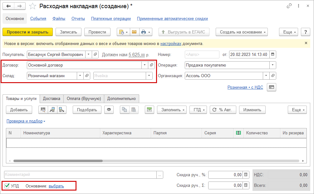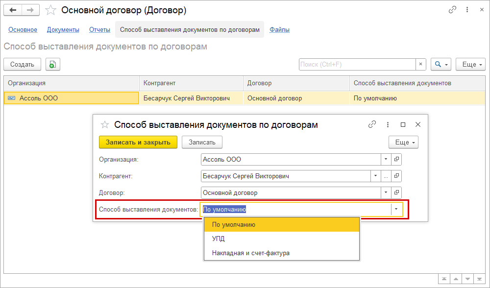 Упростили заполнение признака "УПД" во всех документах. Теперь запоминается последнее выбранное значение и подставляется в документы с контрагентом при использовании способа выставления документов в договоре - "По умолчанию".