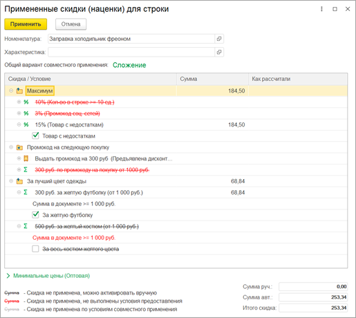 Для управления скидками открываем форму предоставленных скидкам по команде «Еще» в табличной части документа с товарами или двойным кликом по колонке авт.скидок. Выбираем управляемую скидку установкой флажка рядом с условием. Выбранные скидки переносятся в документ по команде «Применить» и доступны после повторного расчета скидок.