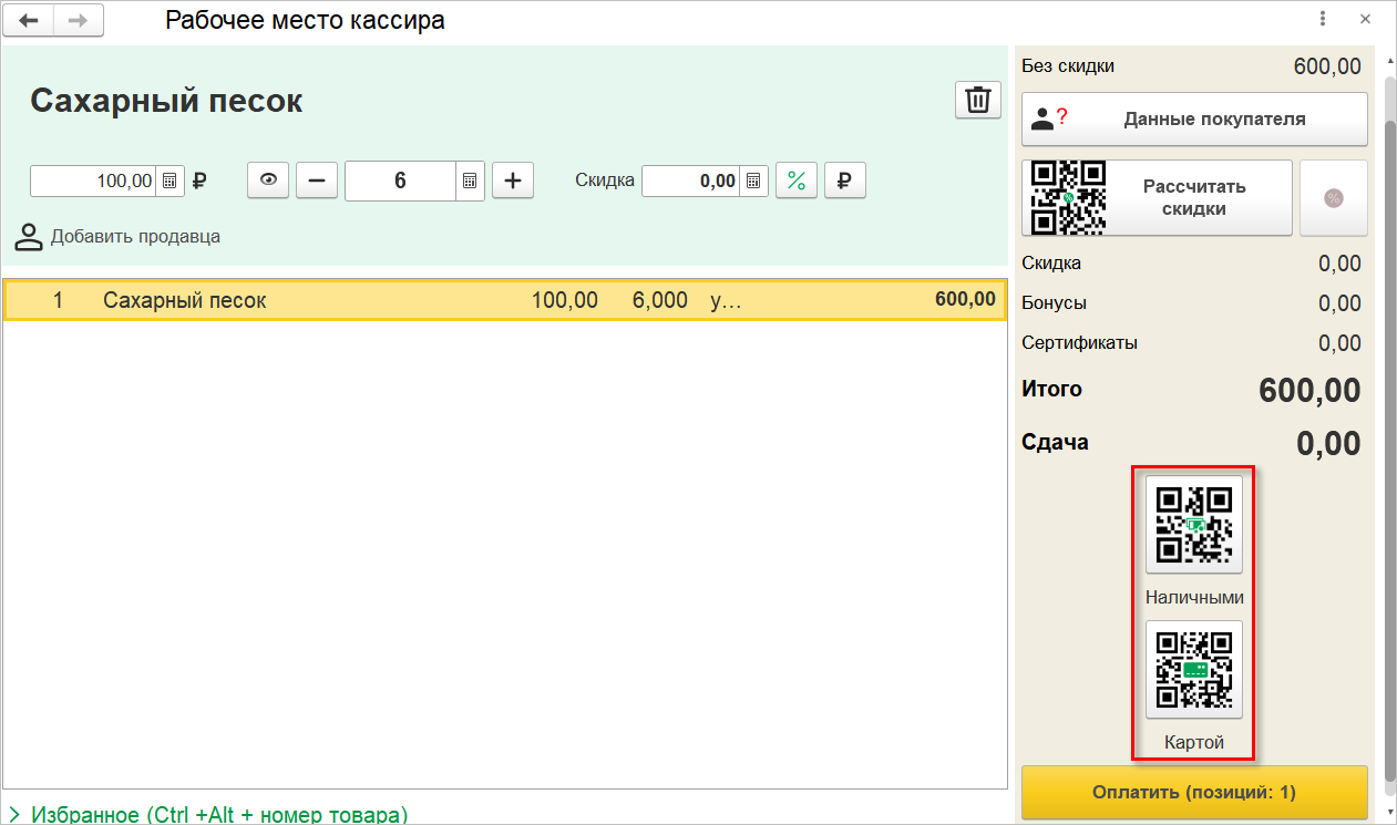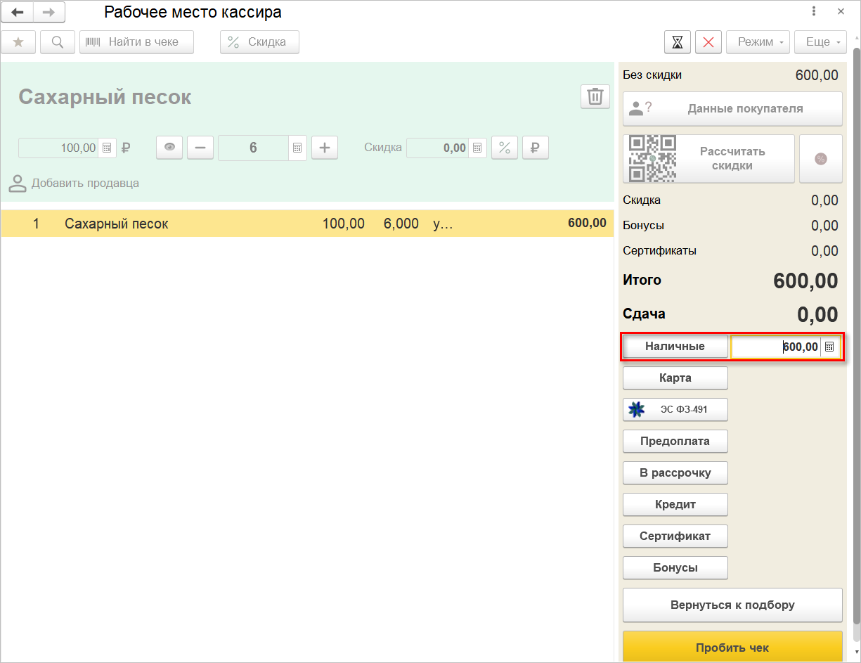После этого автоматически будет выполнен переход в режим оплаты, где для выбранного способа оплаты будет заполнена сумма. Кассиру останется пробить чек по одноименной команде.