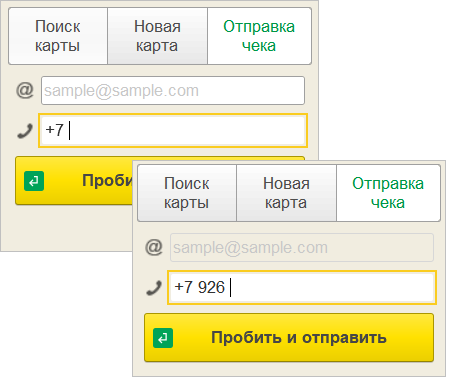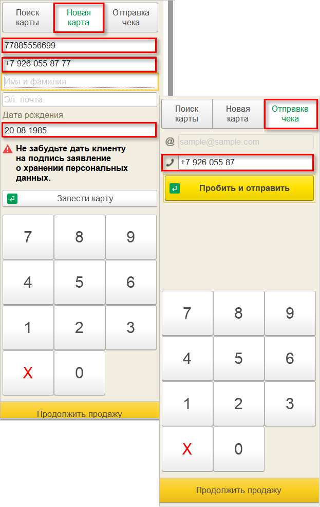На странице создания новой карты при активации одной из ячеек: номер карты, номер телефона или дата рождения так же доступен ввод с цифровой клавиатуры. Аналогичным способом ввести номер телефона можно и на странице отправки чека.