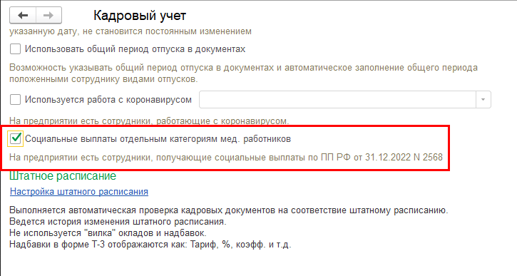 Возможность включается в настройках кадрового учета – флажок "Социальные выплаты отдельным категориям мед. работников".