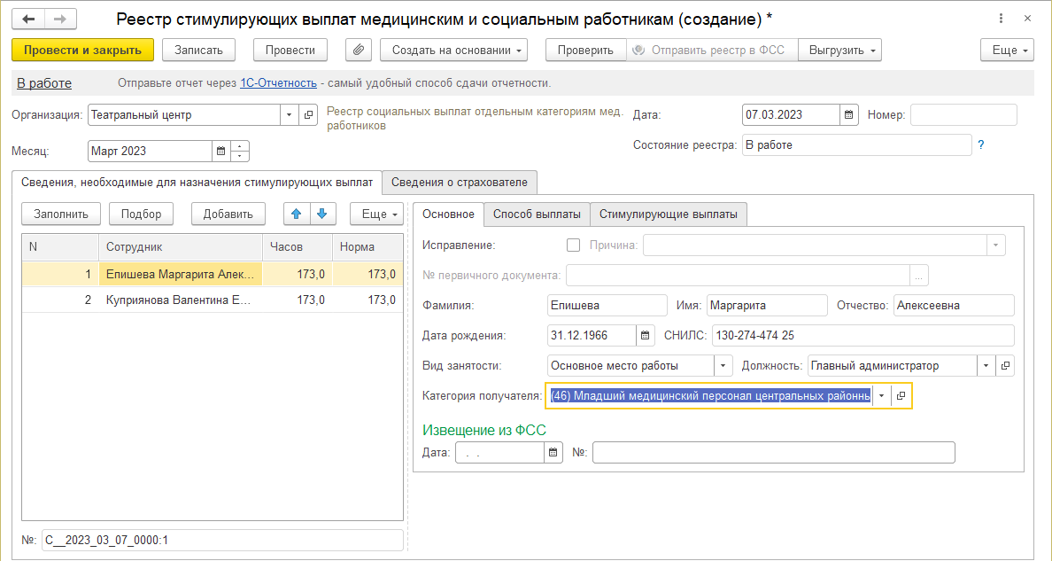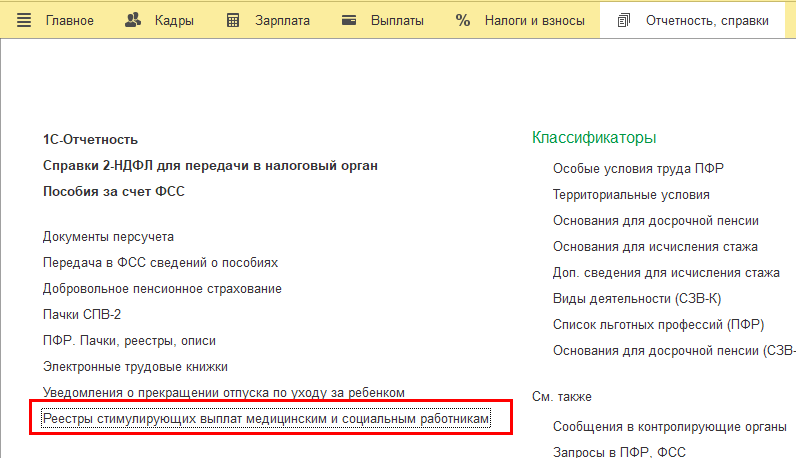 В разделе "Отчетности, справки" – "Реестры стимулирующих выплат медицинским и социальным работникам" появляется возможность создать документ "Реестр социальных выплат отдельным категориям мед. работников".