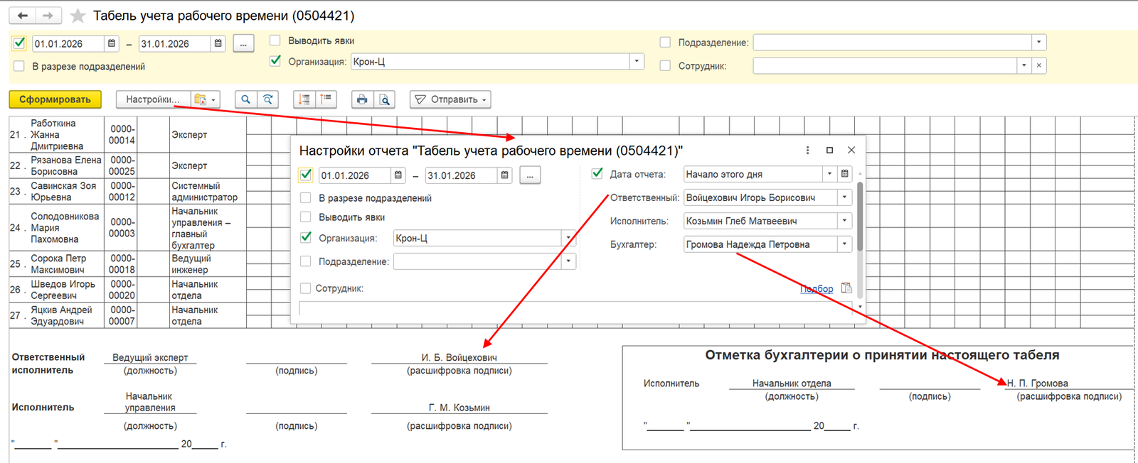 В отчет "Табель учета рабочего времени (0504421)" добавлена возможность указать ответственного исполнителя и бухгалтера.
