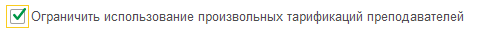 При заполнении документов "Тарификация преподавателей" и "Оплата проведенных учебных занятий", когда выбран способ ввода «По учебному плану», появилась возможность запретить добавление составных частей тарифной ставки или оплаты фактически проведенных занятий вручную Это так называемый «гибридный» режим. Для этого в настройки СОТП предусмотрен флаг «Ограничить использование произвольных тарификаций преподавателей».