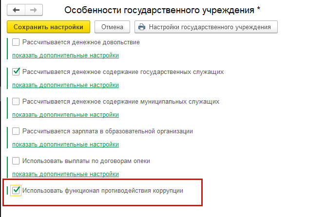 Новый функционал включается в разделе Настройка – Особенности государственного учреждения – Использовать функционал противодействия коррупции. Настройка доступна, если рассчитывается денежное содержание государственных или муниципальных служащих.