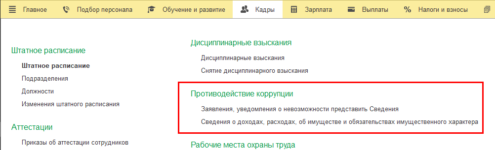 В разделе Кадры появляется раздел Противодействие коррупции.