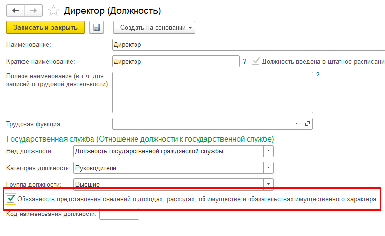 В карточке должности появляется флажок "Обязанность представления сведений о доходах, расходах, об имуществе и обязательствах имущественного характера".