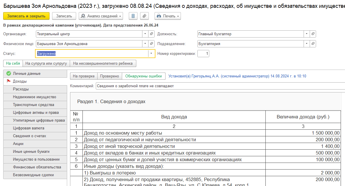 Если супруг/супруга заявителя работает в этой же организации или в любой другой организации, учет по которой ведется в программе, то и по супруге/супругу будет произведена полная проверка сведений аналогично, как и по самому заявителю.