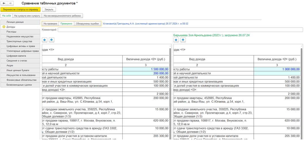 В соответствии с рекомендациями Министерства труда и социальной защиты при проведении анализа необходимо сопоставлять справку со справками за предшествующие периоды. Для этого разработана форма визуального сравнения справок. Сравнение справок производится по разделам. Пиктограммой отмечены разделы, в которых обнаружены расхождения. Расхождения подсвечиваются и кнопками ВВЕРХ или ВНИЗ можно просмотреть их по очереди. В этой же форме можно установить статус проверки раздела и заполнить комментарий.