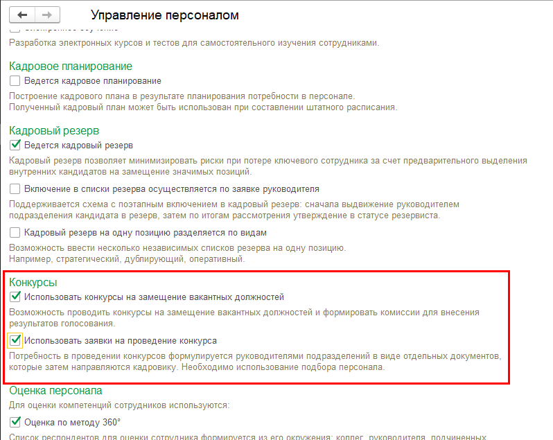 Возможность включается в настройках управления персоналом – группа Конкурсы.
