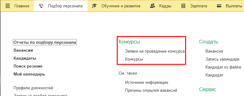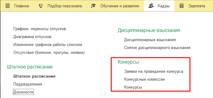 После включения в разделах "Кадры" (для кадровика) и "Подбор персонала" (для руководителя) появляется раздел Конкурсы.