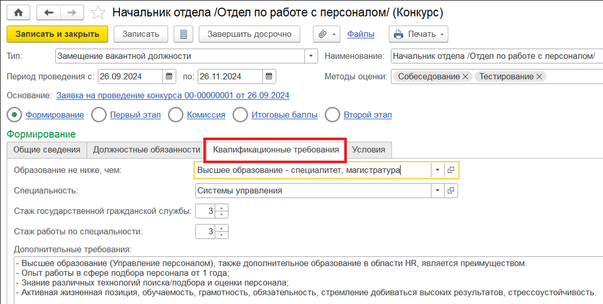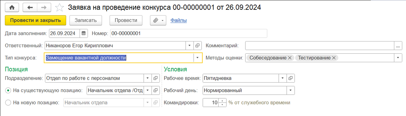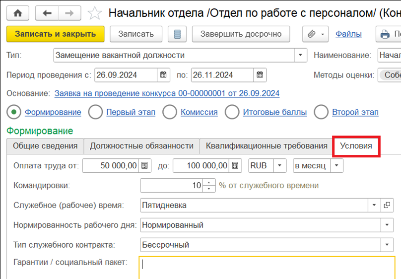 Конкурс может проводиться как на замещение вакантной должности, так и на включение в кадровый резерв (этот функционал рассмотрен в следующем разделе).