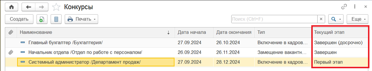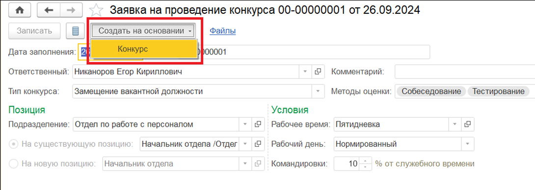После того как руководитель оформил заявку, кадровик на её основании может создать конкурс.