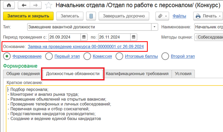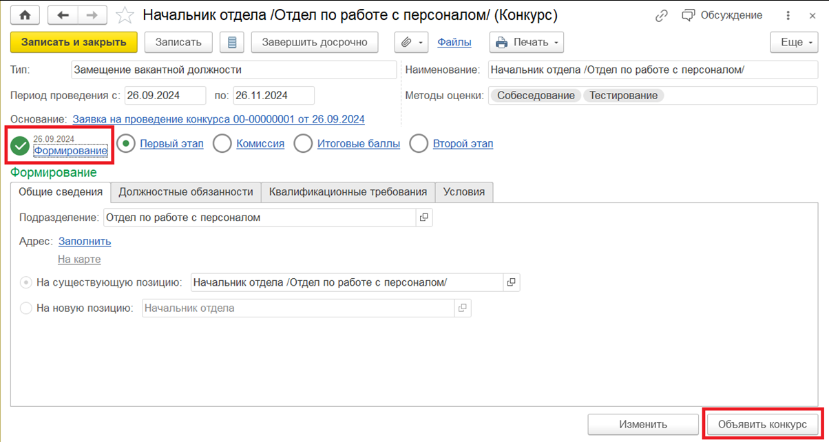 Кадровик дозаполняет в конкурсе необходимые данные и нажимает кнопку "Объявить конкурс".