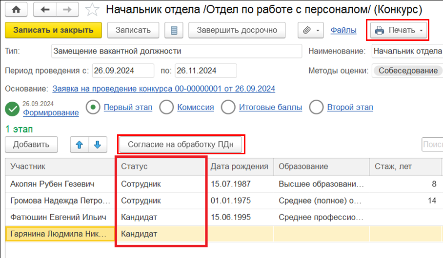 После этого, на первом этапе необходимо сформировать список участников – ими могут быть как действующие сотрудники, так и внешние кандидаты. Имеется возможность сформировать согласие на обработку персональных данных. Также в меню Печать есть возможность формирования других важных печатных форм.