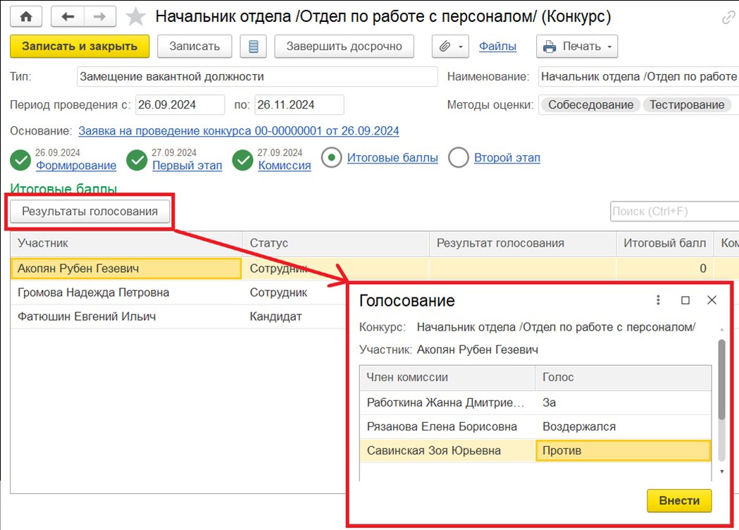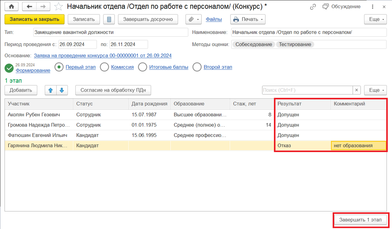 В завершение первого этапа необходимо внести результаты рассмотрения кандидатов, вписать комментарии и нажать соответствующую кнопку.