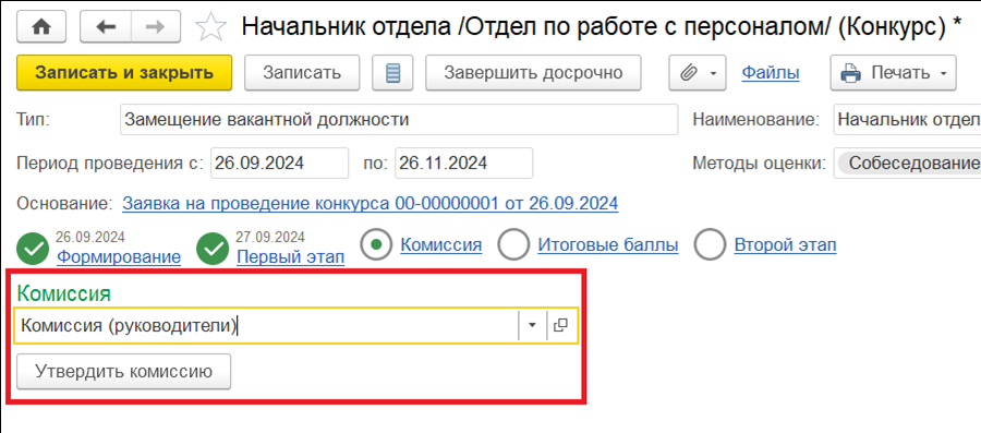 После создания комиссии её следует выбрать в конкурсе и нажать "Утвердить комиссию".