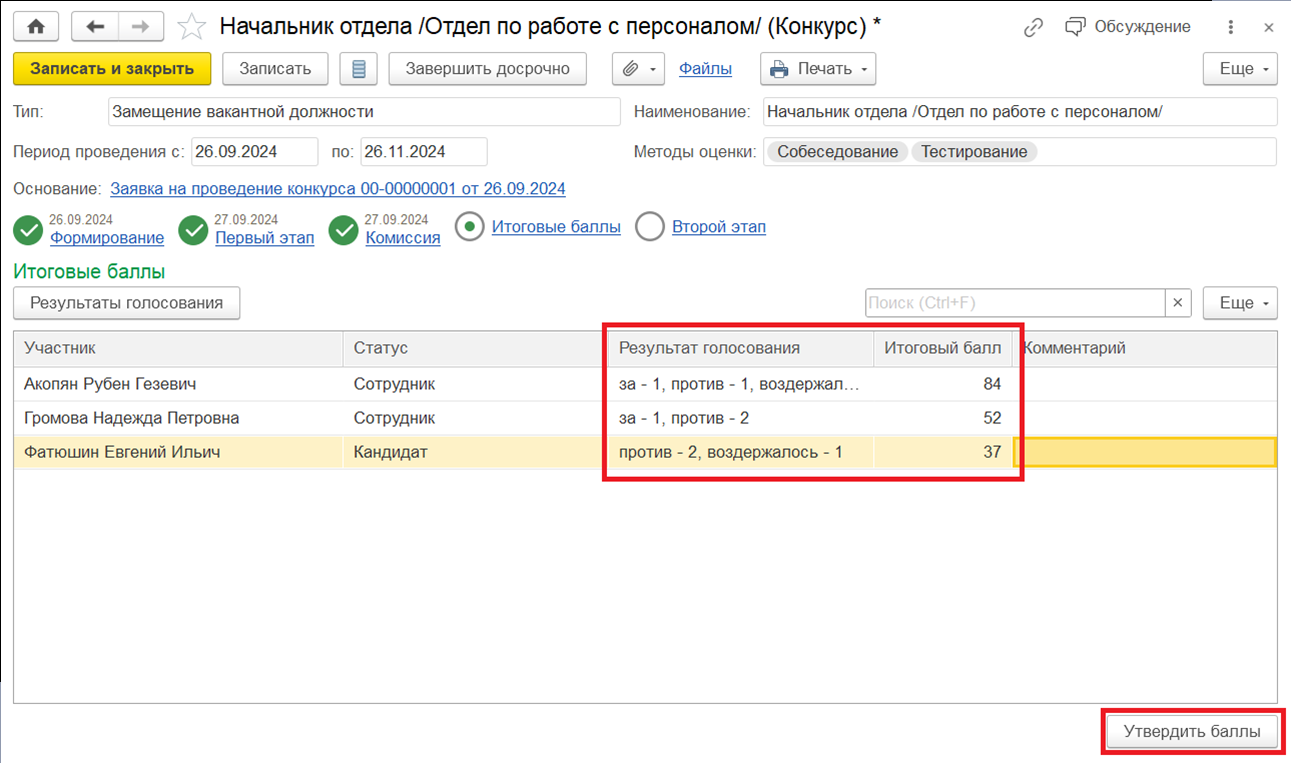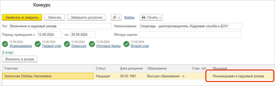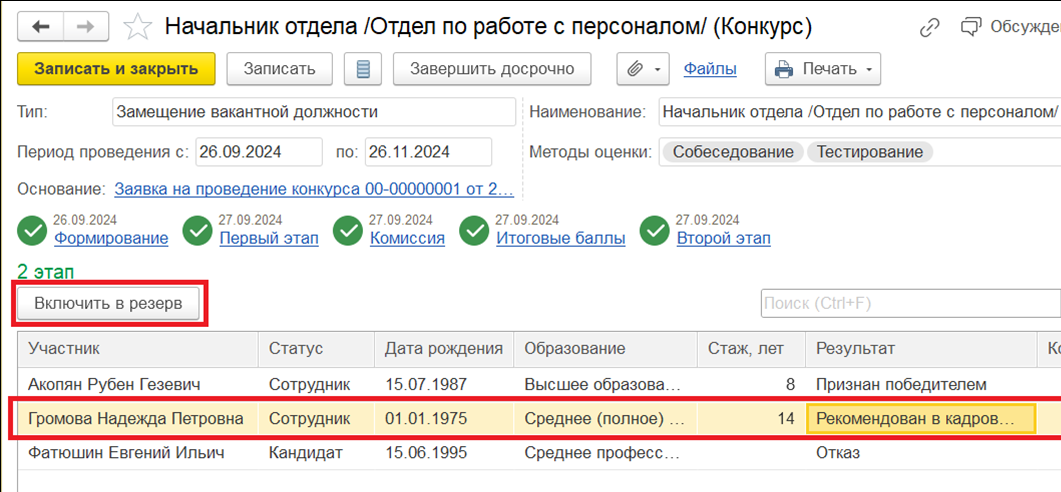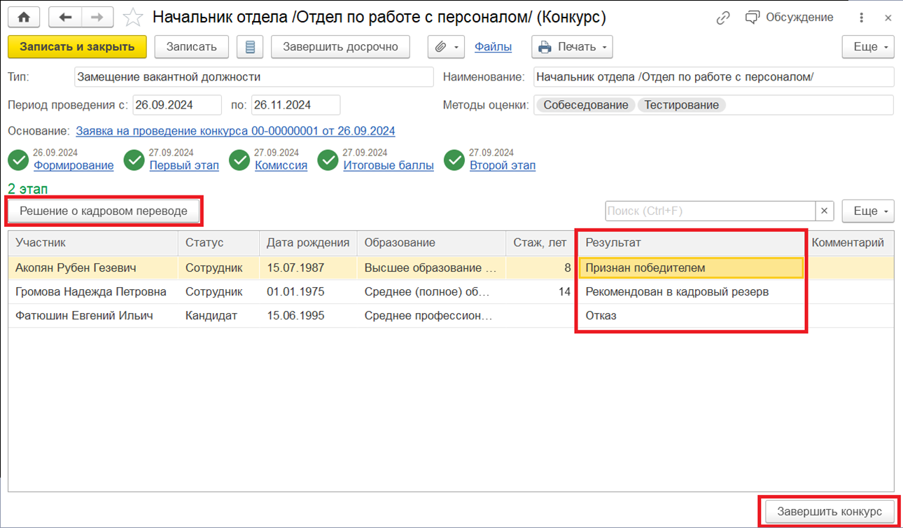 После утверждения баллов переходим к завершающему этапу – второму. На нём необходимо указать, кто стал победителем конкурса, кто рекомендуется в кадровый резерв, кому было отказано. После чего завершить конкурс.