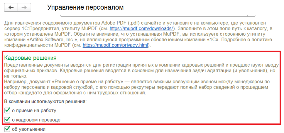 После этого становятся доступны команды для дальнейшего продвижения участников конкурса в программе. Для этого рекомендуется, чтобы в настройках было задействовано использование кадровых решений (в частности, о приеме – для внешних участников и переводе – для текущих сотрудников).