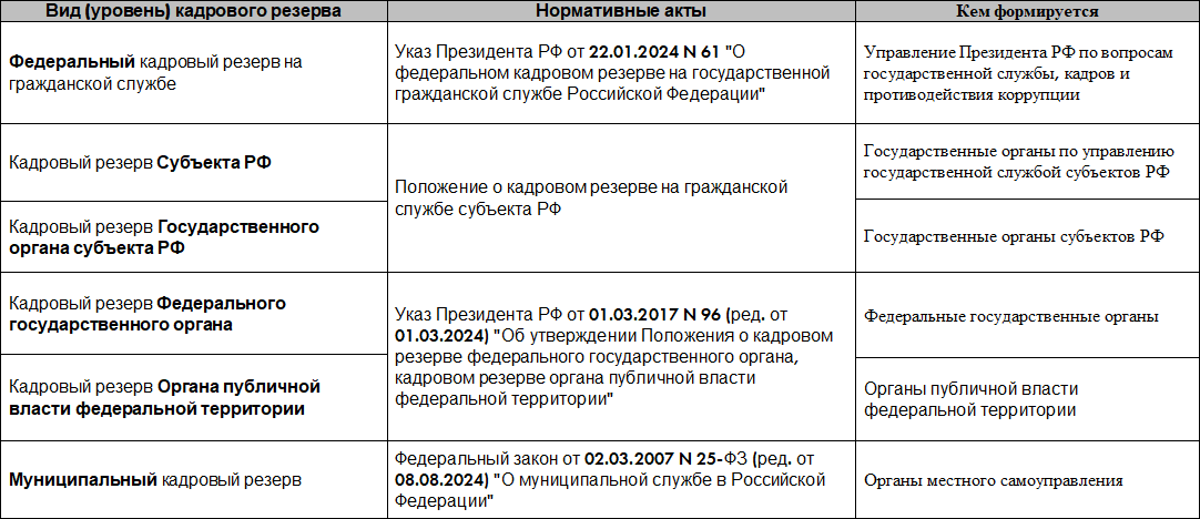 Существует несколько видов (уровней) кадрового резерва. Каждый вид имеет свой порядок формирования и регламентируется своими нормативно-правовыми актами.