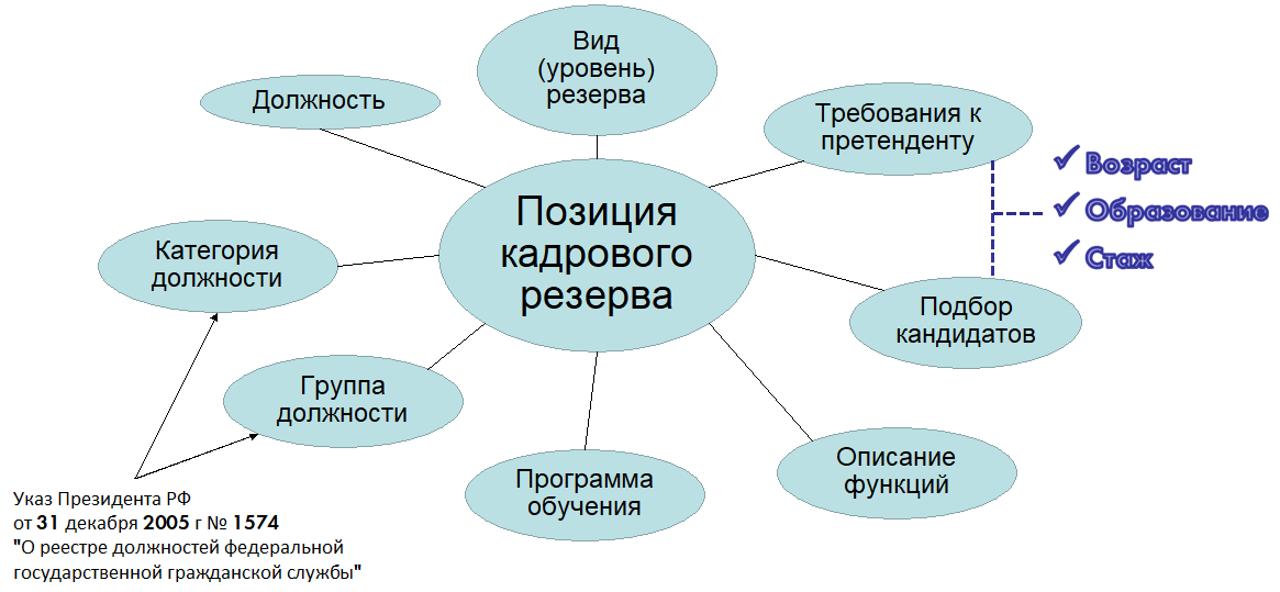 Кадровый резерв – группа лиц, соответствующих требованиям для замещения должностей гражданской службы. Общий порядок формирования кадрового резерва описан в Федеральном законе от 27.07.2004 № 79-ФЗ "О государственной гражданской службе Российской Федерации" (Статья 64).
