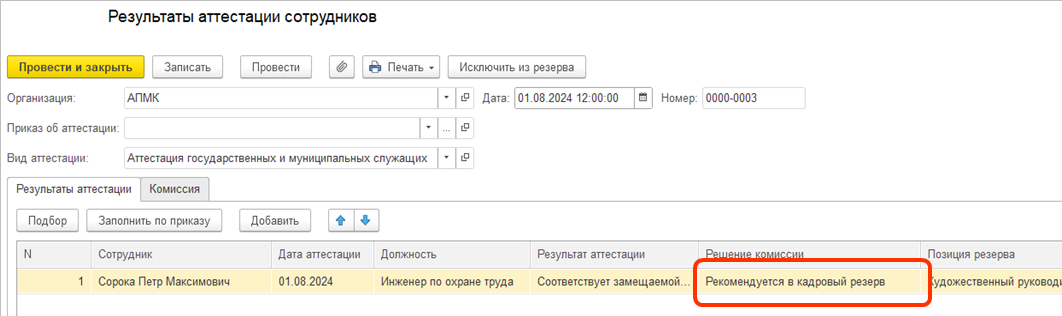 Включение в кадровый резерв, а также исключение из кадрового резерва оформляется правовыми актами. В программе предусмотрены печатные формы приказов включения в кадровый резерв, исключения и приложений к ним.