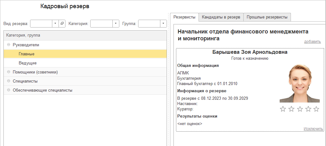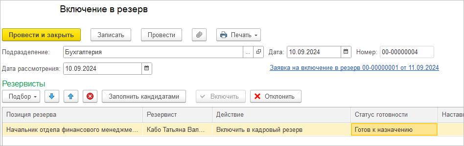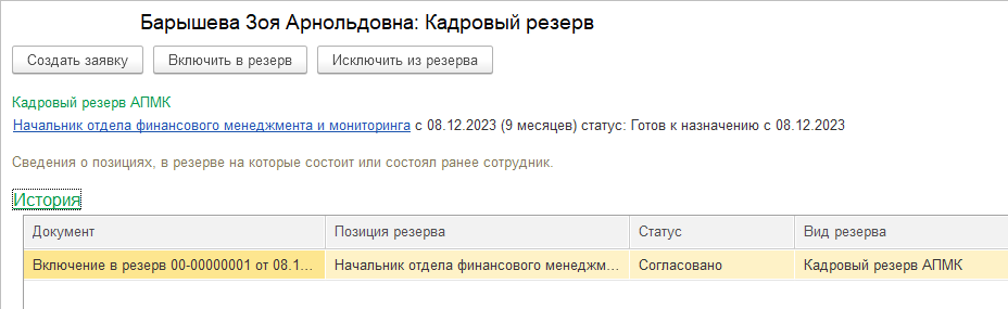 В этой же форме может осуществляться включение в кадровый резерв и исключение из него.